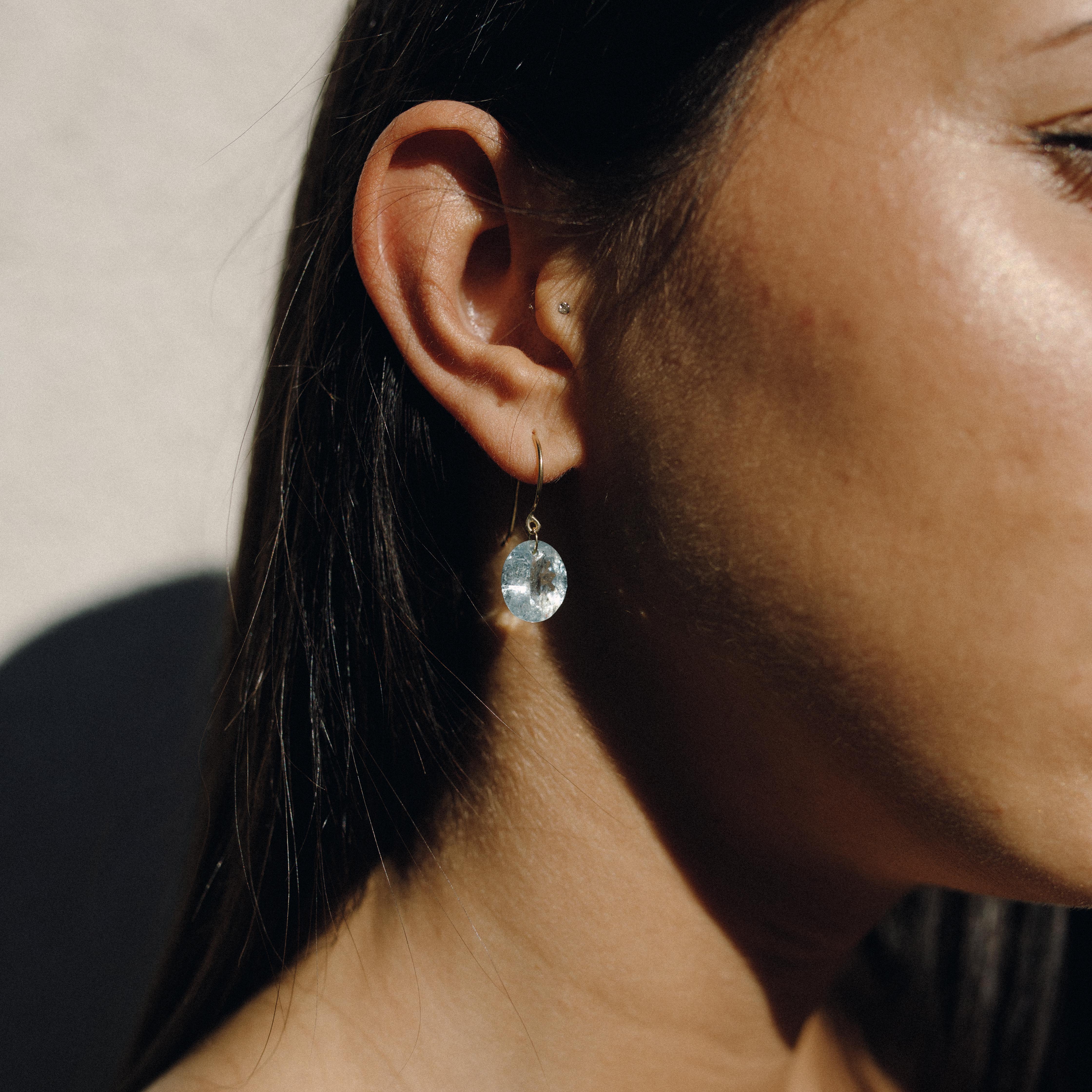 Orecchini in oro giallo 18 carati con acquamarina azzurra.