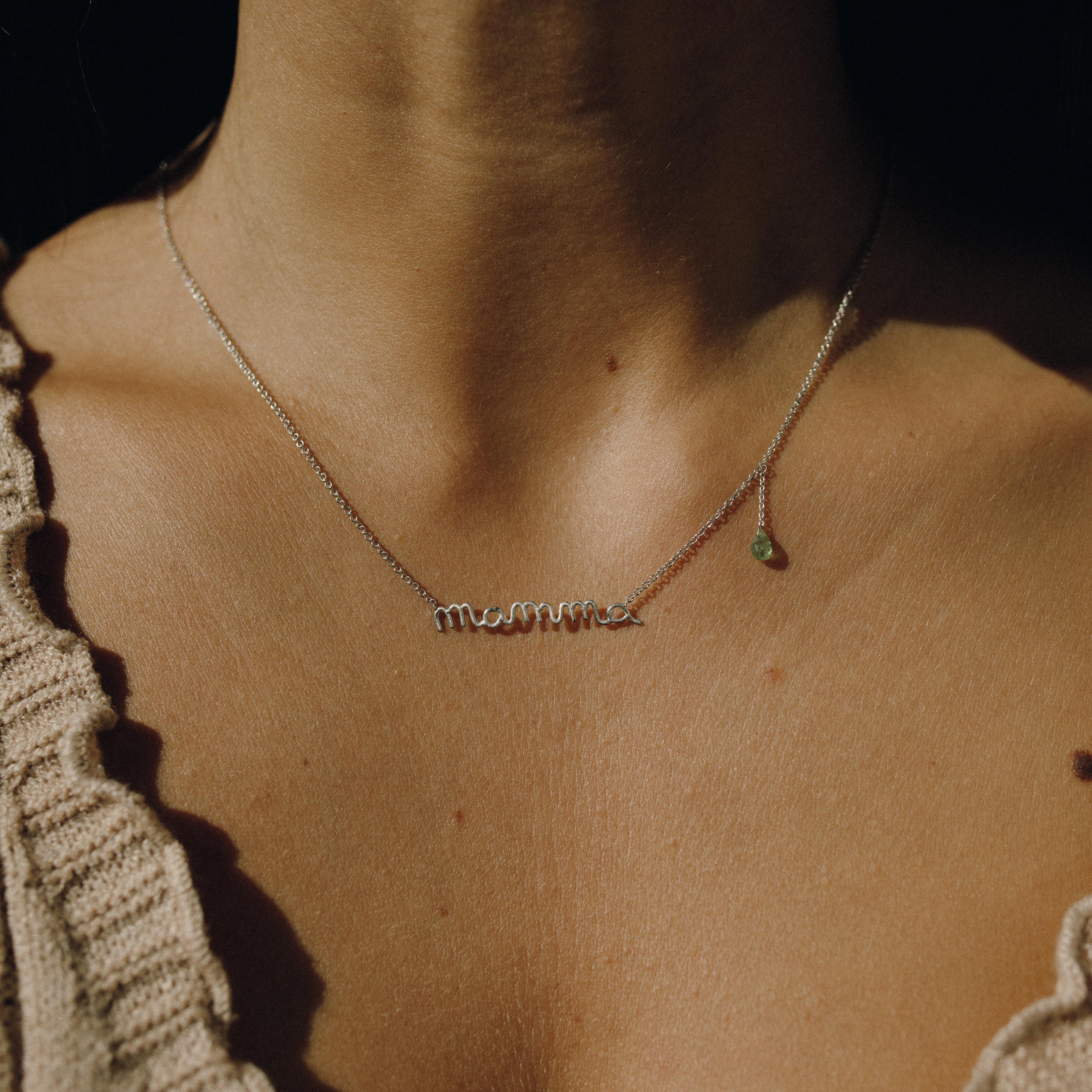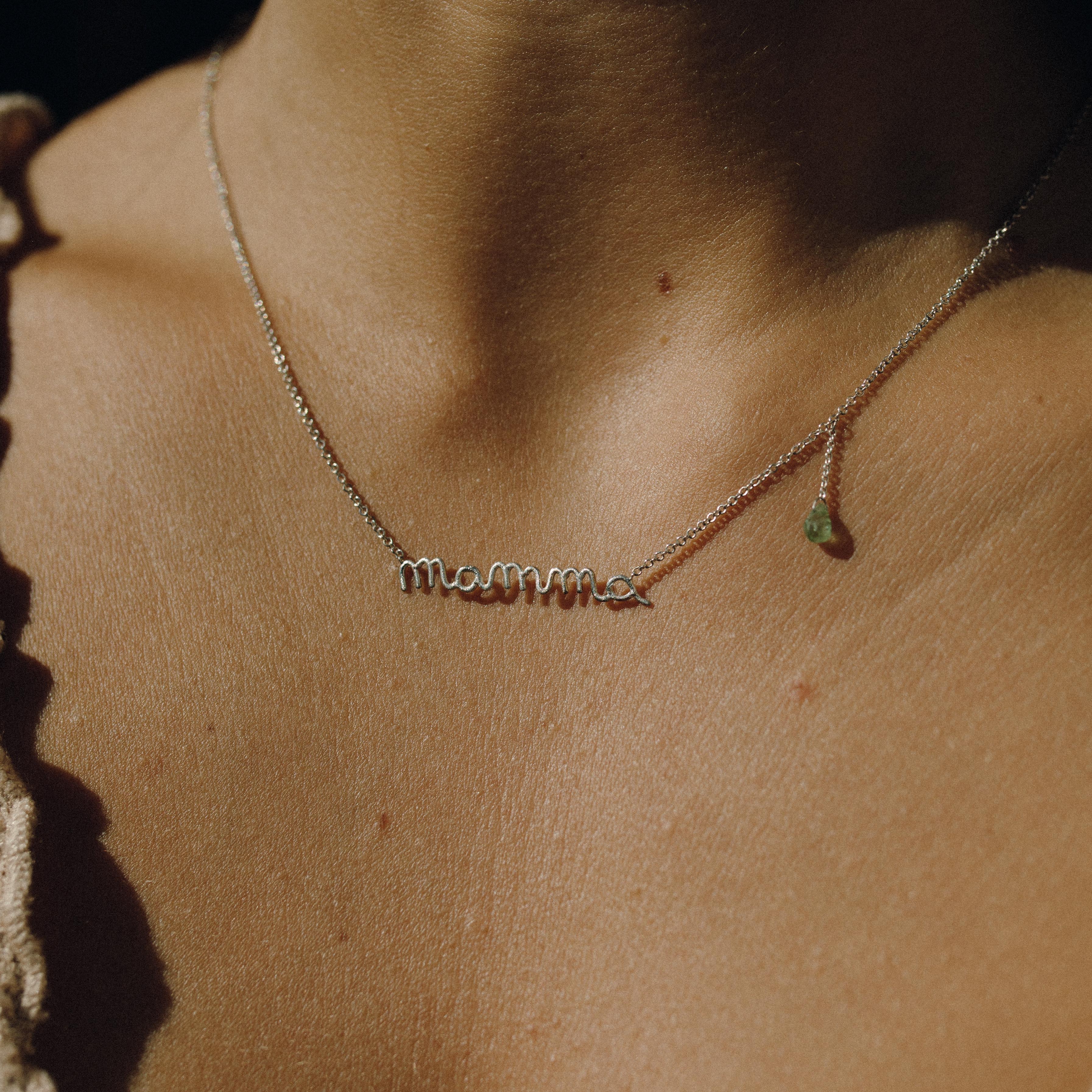 Mamma - Collana con scritta in argento 925 e goccia di tormalina verde