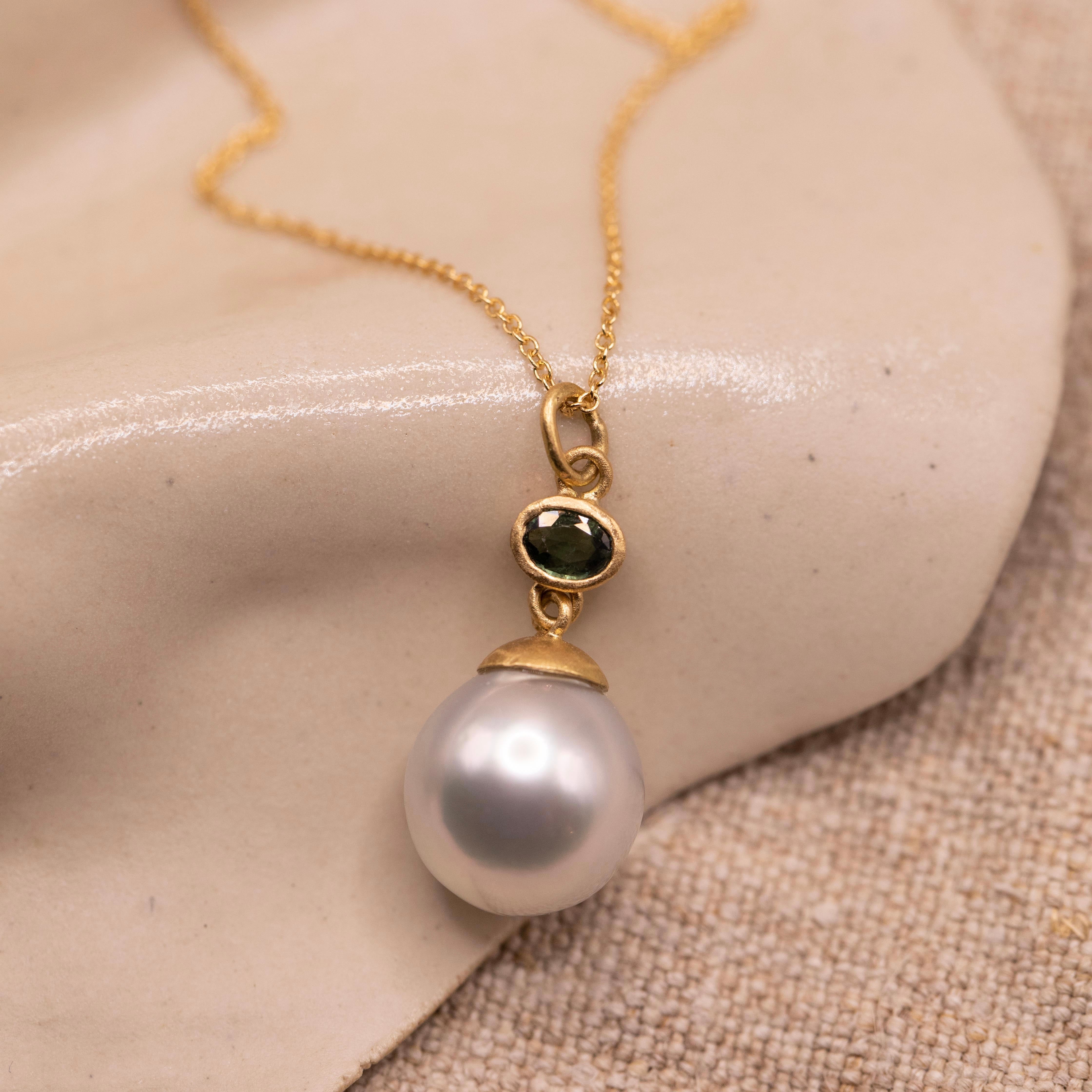Ciondolo in oro giallo 18 carati realizzato con oro ecologico, perle bianche tracciate dei mari del Sud e Zaffiri verde dello Sri Lanka.
