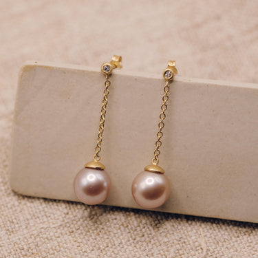 Orecchini in oro giallo 18 carati con perle d’acqua dolce rosa e diamanti incolore Ocean Diamonds da 0,03 ct ciascuno.